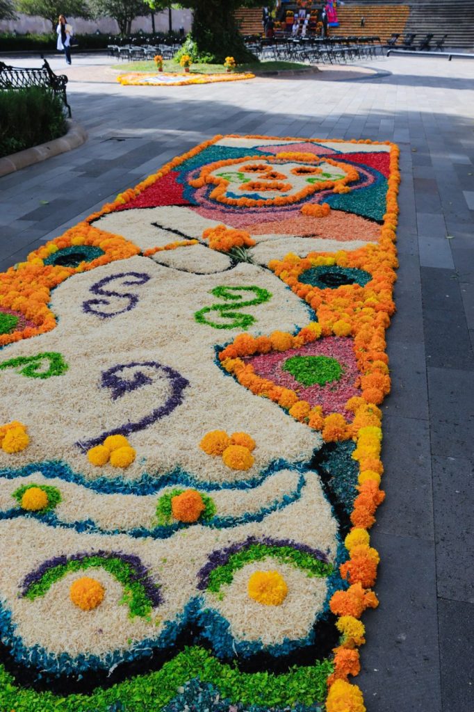 En este emblemático espacio, el alcalde Varela, acompañado de diversas áreas del Ayuntamiento, inauguró la exposición de tapetes tradicionales y artísticos y un altar monumental dedicado a la memoria de diez destacados artistas zacatecanos.