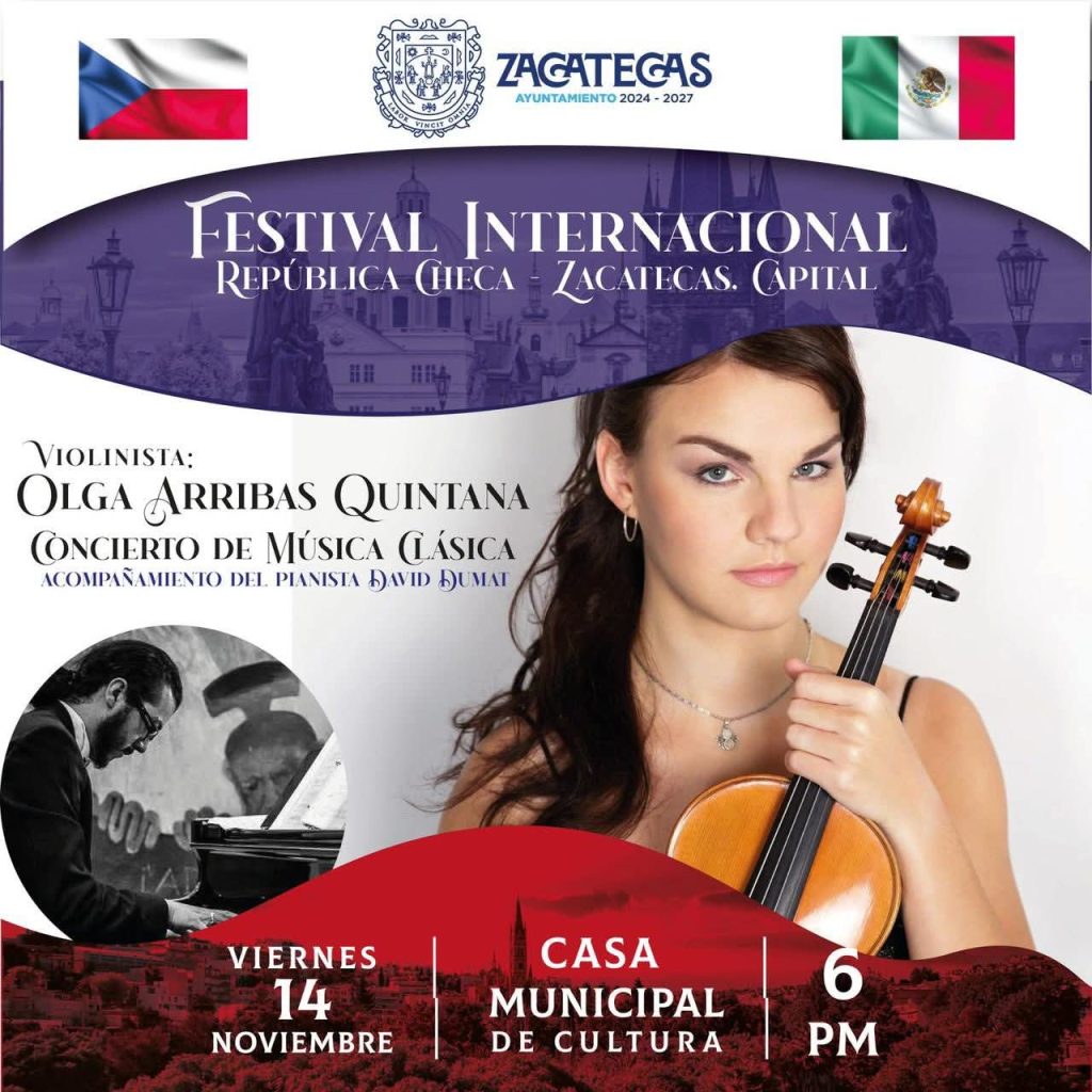 El viernes 14 de noviembre, la jornada continuará con una Clase Magistral de Música en la Escuela de Música de la BUAZ a las 12:00 p.m., impartida por destacados artistas checos. Por la tarde, se ofrecerá un Concierto de Música Clásica a cargo de la violinista Olga Arribas Quintana, acompañada del pianista David Dumat, en la Casa Municipal de Cultura a las 6:00 p.m.